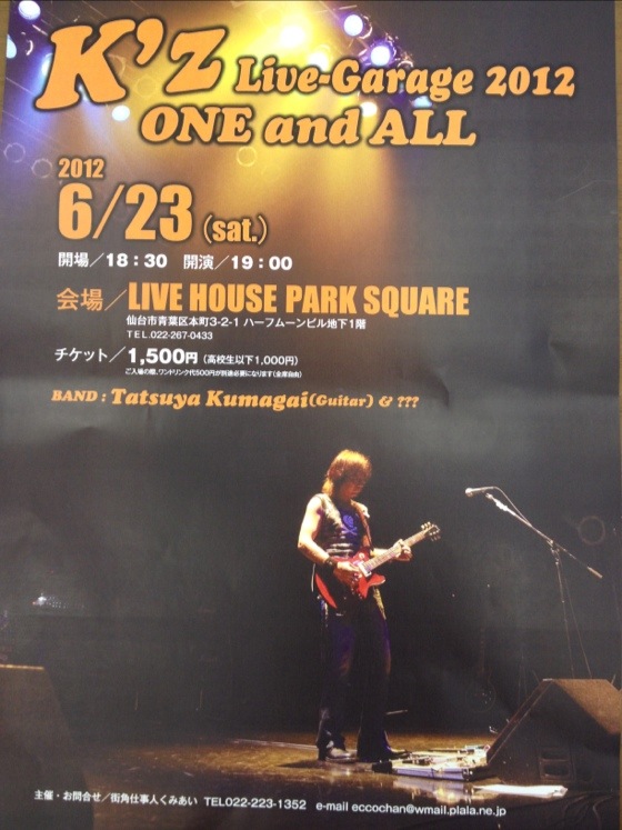 K’z ライブ 2011 Author Masasy Date 2012年6月14日 熊谷達也さんのバンド【K’z】が2年ぶりにライブをします。 新ボーカルを迎え、新たにスタート 6月23日土曜日 開場 18時30分 開演 19時00分 チケット 1500円 高校生以下 1000円 会場 LI