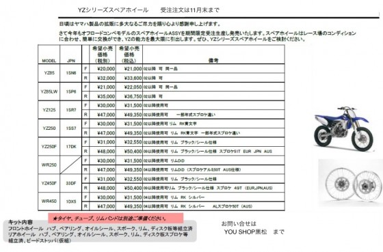 YZシリーズのスペアホイールセットは今月末までの受注です Author Masasy Date 2012年11月9日 毎年受注販売しておりますYZシリーズのスペアホイールセットですが、今年は11月末までの受注予約となってます。 他メーカーでもハブやリムが発売されておりますが、組み込み済みでディスクローター、スプロケットまで装着されてます
