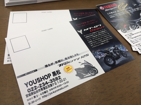 MT-07のDM完成です! Author Masasy Date 2014年9月5日 Comments: Leave a comment YAMAHAのDMデーターを使ってYOU SHOP黒松のお客様へのMT-07デビューのDMをデザイン、制作をしました。印刷は外注ね… このDMが届いたアナタは! 買うしかない(^O^)/ 同業のみなさん 制作、構成、印刷(外注) 私が承ります。