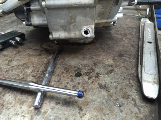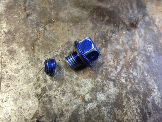 幸か不幸か社外のマグネット入りのアルミボルトだったんで、センターに穴を開けての逆タップは無理だとイメージして、他の案を考えながらエンジンを下してました。