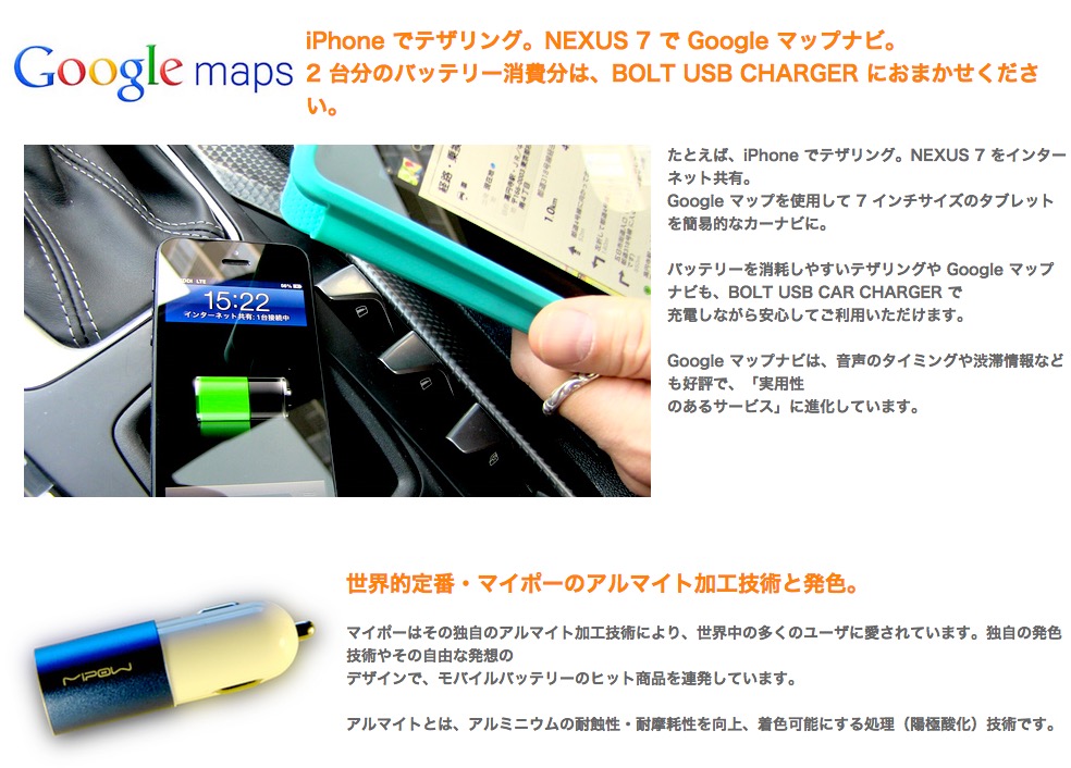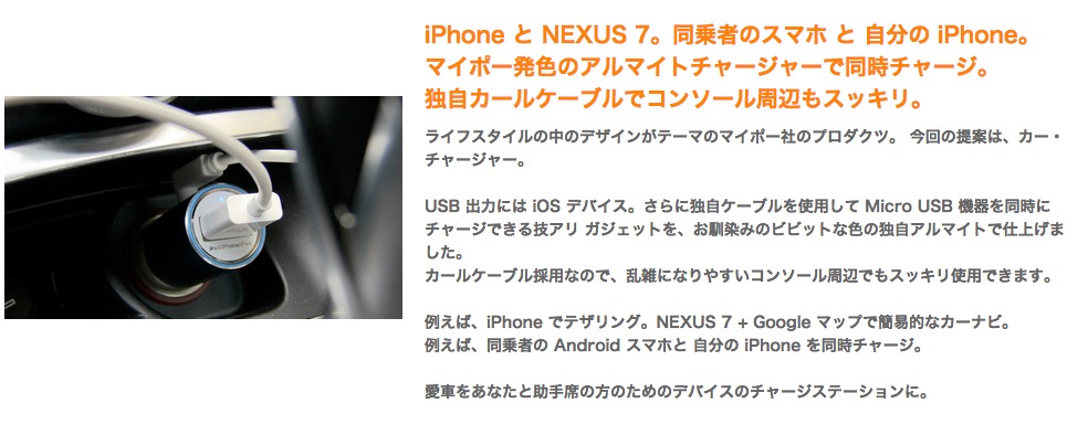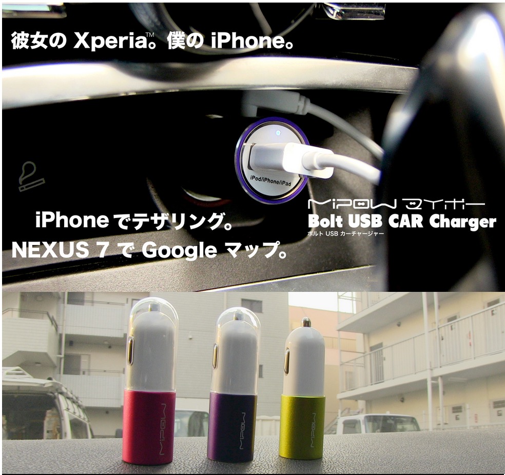 USB チャージと専用 Micro USB ケーブルチャージャーの 2台を同時充電可能 Author Masasy Date 2014年10月28日 Comments: Leave a comment ヘイポーじゃないよ「マイポーの BOLT USB CAR CHARGER」 Android系のタブレットとiPhoneの2台持ちで移動される方は良いかと 12V-24VまでOKなのでトラック等の24VのクルマでもOK 税込980円で当店店頭でのみ販売します。 在庫数 ブルー:2 パープル:1 イエロー:1 ブラック:1
