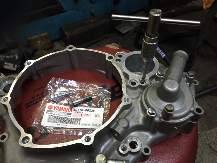 今回はエンジンオーバーホールでしたので、ケースカバーを外した状態でナメたネジ山をタップで切り直してます。
