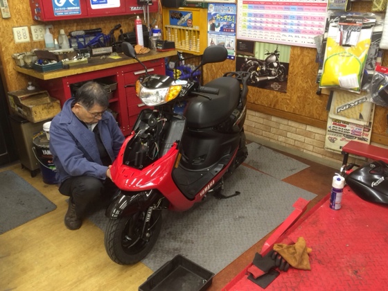 中国 重慶ヤマハ製造のJOG100が入庫しまもなく整備が完了します。