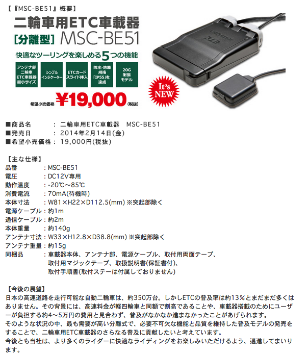 自動車や二輪車の部品・用品の開発・販売を手がける株式会社ミツバサンコーワ(所在地:東京都板橋区、代表取締役社長:柚木 洋)は、二輪車用ETC車載器の普及・促進のため、信頼性はそのままに必要不可欠な機能に絞り込んだ普及モデルの分離型 二輪車用ETC車載器『MSC-BE51』を2月14日に発売いたします。