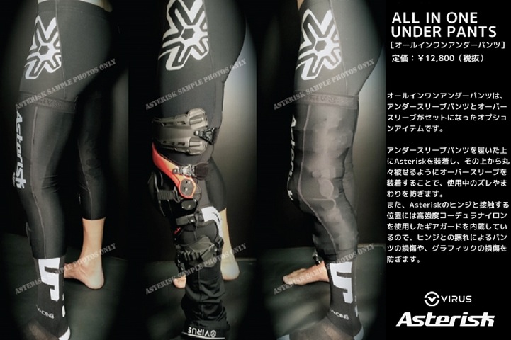 そんなVIRUSがAsteriskの要望を受け、CELLニーブレース装着時のズレや、パンツ、グラフィックの保護を目的としたオプションアンダーパンツを開発しました。世界中のAsteriskユーザーから寄せられた改善要望に応えるべく開発されていて、ユーザーの悩みを解消するものとなっています。