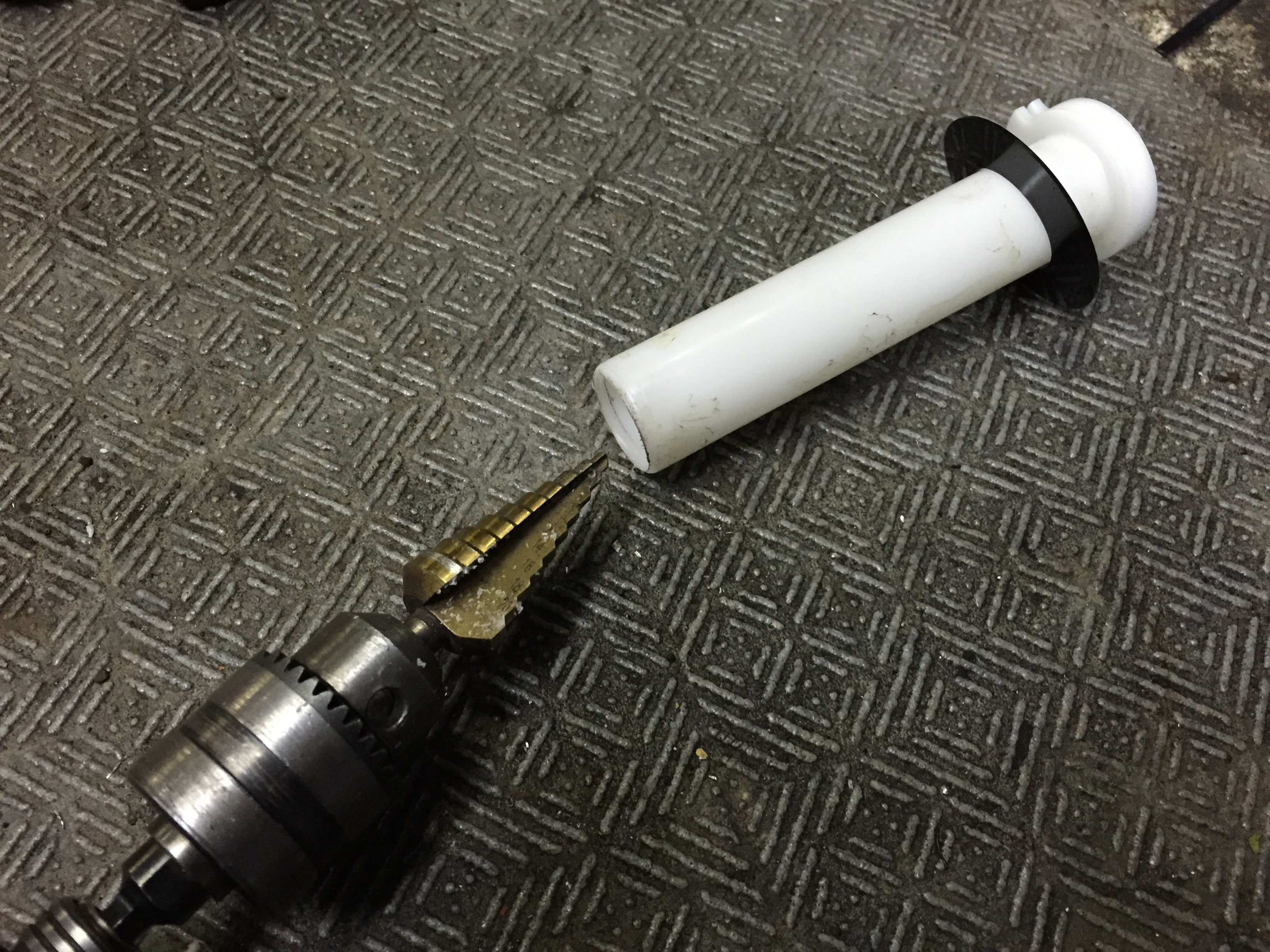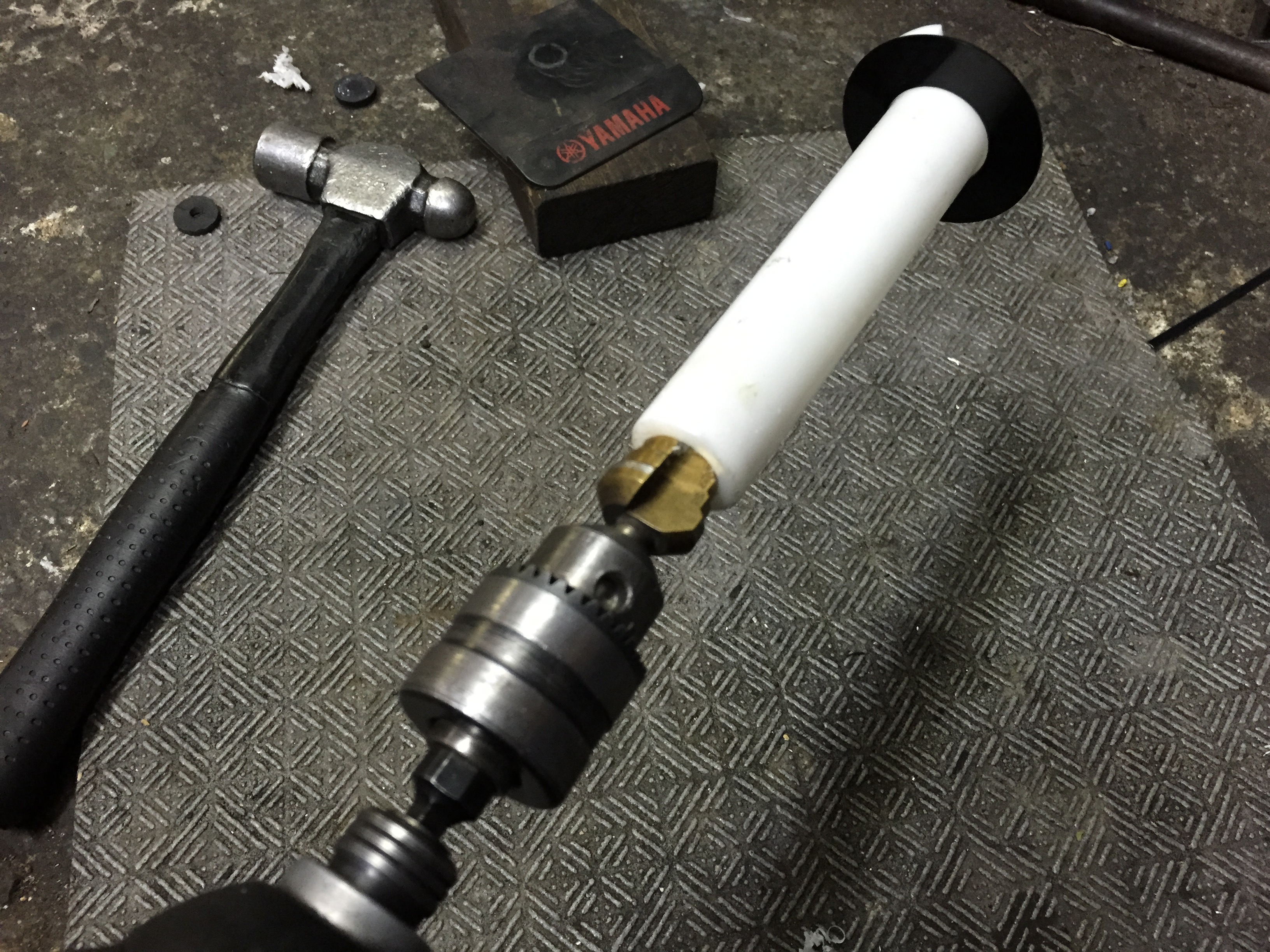 そして、アクセル側のカラーはステップドリルで22mmまで拡大します(ハンドルのエンド部とツラにする場合は23mm)