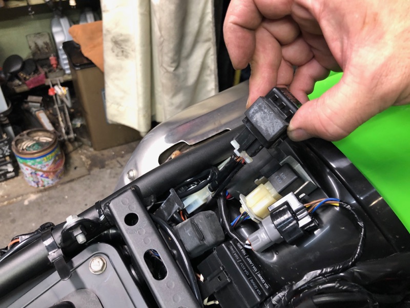 タンクを取り外している場合はハンドル周辺からのUSBソケット等の配線をハンドル→メーターステー→左ラジエター上部→フレーム前部中央と車体の配線類と一緒に添わせて